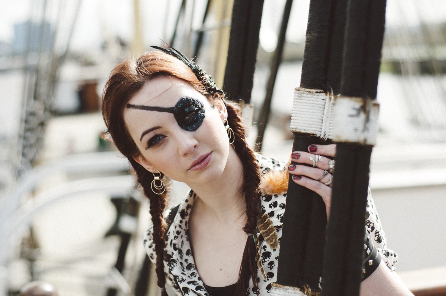 The next morning was the fastest photoshoot in the world, on board the Tall Ship at the Transport Museum, where we were most not-welcome to take photos so we had to be quick. Here’s mega-babe model Victoria Wheelan sporting a glamorous pirate eye-patch I created with black eyeliner and black sequins glued on top with lash-glue.
