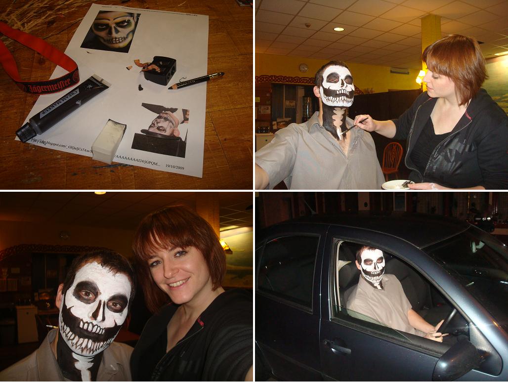 Since we’re here, here’s Agi and Paul, both with a quarter-face skull done by me for Halloween 2010. Looking at this photo now I am going to guess (cos I can’t remember) that the black in the eye sockets and on the nose is MAC Paint Pot in Blackground, and the white is Snazaroo Clown White. By the by, Clown White is more comfortable to wear and doesn’t flake as much as cream makeup, and you can build it up as you want it (you can see it extends down to the jawline on Agi, and is much more opaque from the teeth up where I’ve put on additional layers). So for whitening up a bigger surface, I’d recommend it over cream makeup, even though it’s probably not as opaque even when it’s on nice and thick. It’s just less likely to become dry/uncomfortable, and crack up. Anyway, here they are: