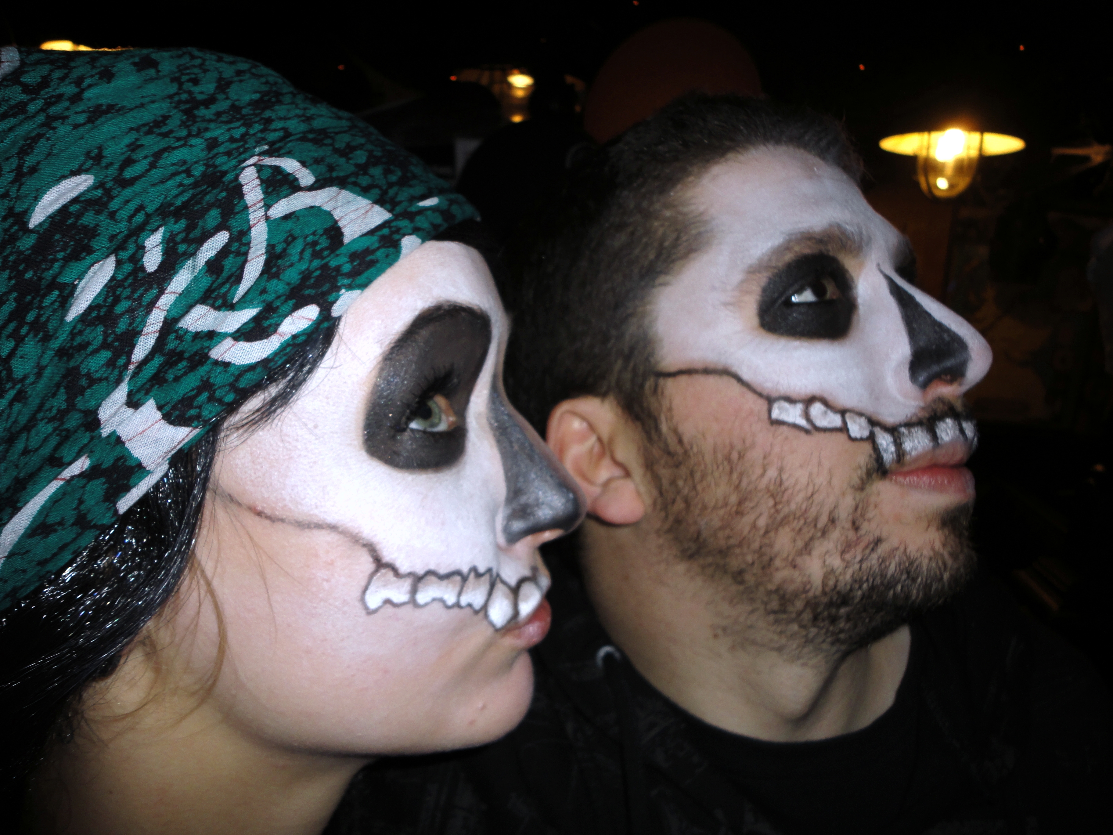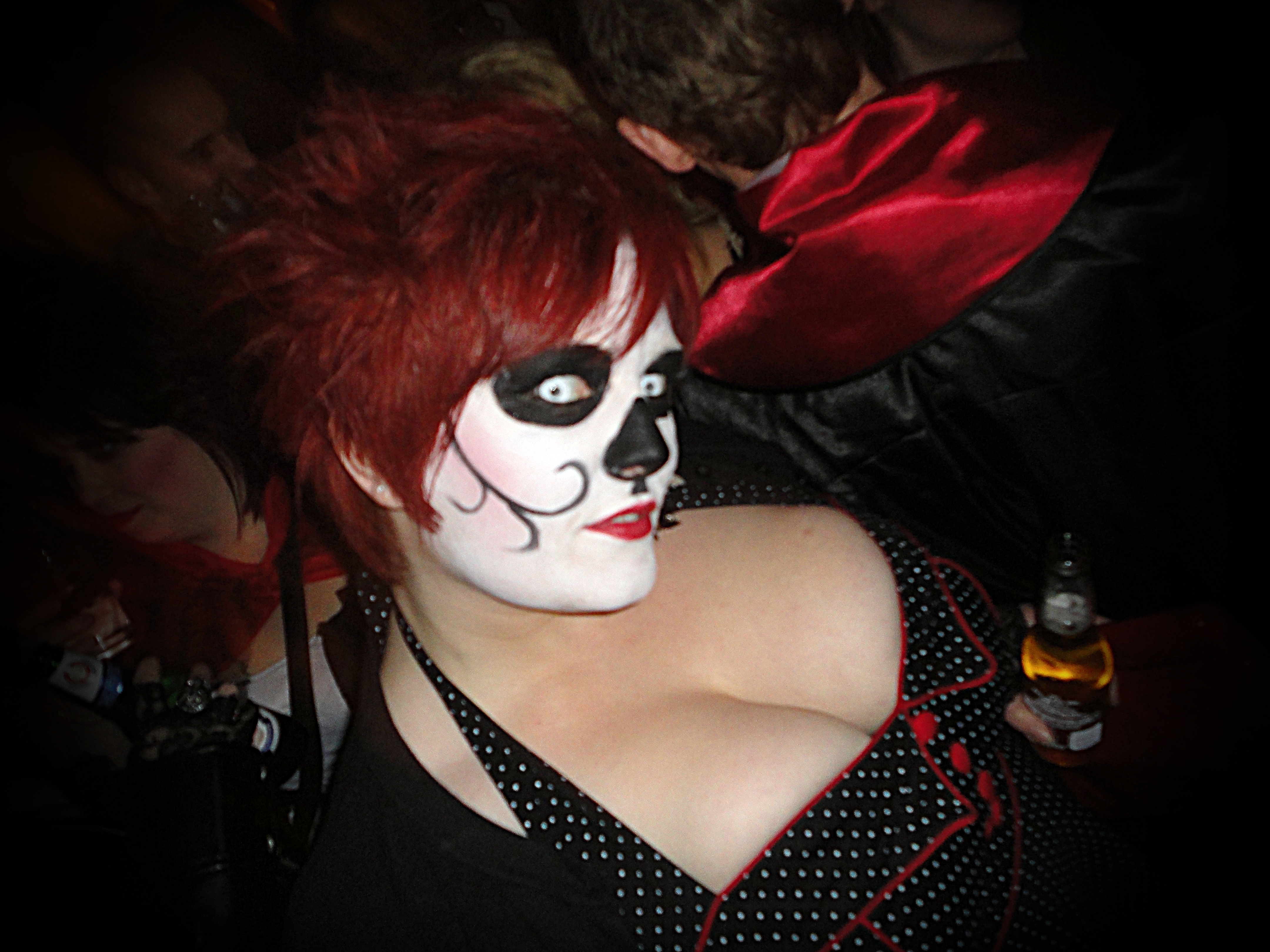 … and from Halloween 2012, here’s my friend Joy looking amazing as a sugar-skull. It wasn’t me that did the makeup, but I love her look; the cherry-red hair and white contacts, wow –