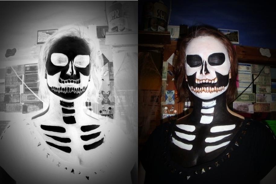 I like skeletons. I have skull-motif everything. If it comes in a bones version, I’ll take that one. It’s no surprise, then, that one of my first major Halloween face-paint undertakings was skull makeup.