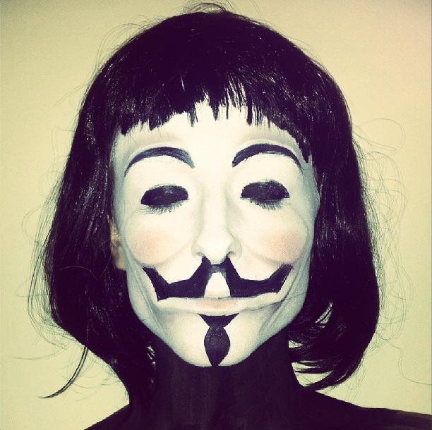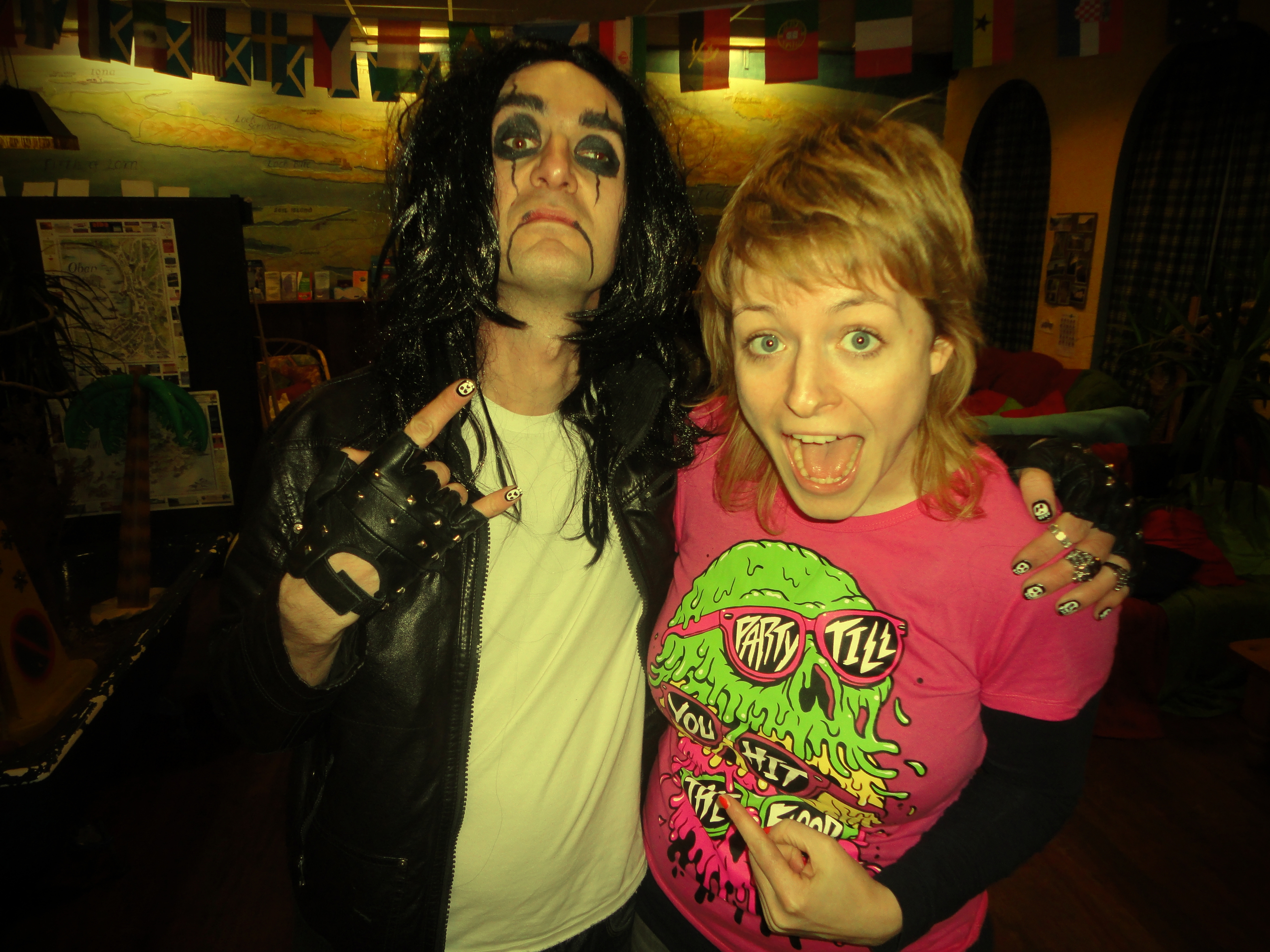 Add a black wig – I found this one under the reception desk – and fingerless stud faux leather gloves. Borrow a leather jacket from a Spanish guy called Sergio (if you can find one), and Bob’s your uncle. Or Grant’s your Alice. Or whatever.